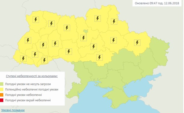 “12 июня днем в Украине, кроме южной части, Днепропетровщины, Донетчины и Луганщины, грозы, на Закарпатье и Прикарпатье сильные дожди, местами град и порывы ветра 15-20 м/с“, - говорится в сообщении.