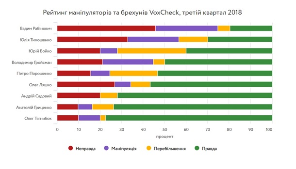 Вадим Рабинович, Юлия Тимошенко и Юрий Бойко возглавили рейтинг манипуляторов и лжецов по итогам третьего квартала этого года. Правдивость фактов в высказываниях украинских политиков проверяла аналитическая организация VoxUkraine, которая опубликовала результаты исследований.