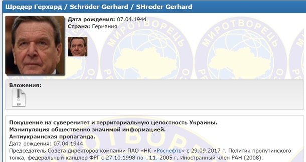 Бывший канцлер Германии Герхард Шредер попал в базу данных сайта Миротворец.