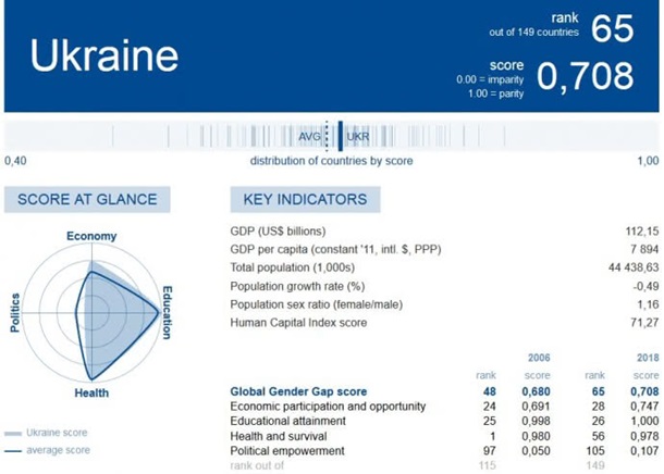 Указано, что лучшая ситуация по равенству возможностей полов в Украине наблюдается в сфере образования. По этому показателю страна занимает 26 место в мире.