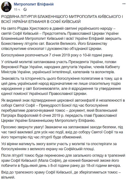 Предстоятель Православной церкви Украины Епифаний 7 января совершит Божественную литургию в соборе Святой Софии, она начнется в 10 утра, сообщается на его странице в Facebook 4 января.