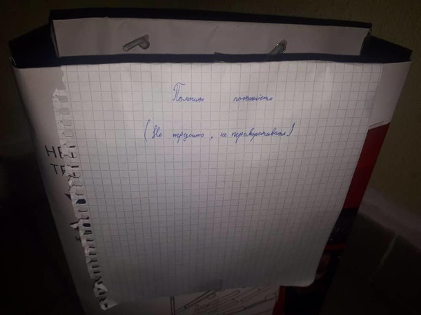 На месте инспекторы обнаружили пакет, в котором была коробка и записка. В частности, детским почерком написано: "Помогите, пожалуйста. (Не трусить, не переворачивать).