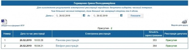 Активисты отмечают, что по данным письменной регистрации нардепов следует, что от имени Геращенко стоит подпись о ее присутствии.
