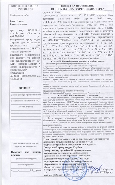 Отмечается, что Вовк должен явиться в Генпрокуратуру 2 августа в 14:00 для проведения процессуальных действий – вручения письменного уведомления о подозрении (ст.278 УПК Украины) и допроса в качестве подозреваемого (ст.224 УПК Украины).