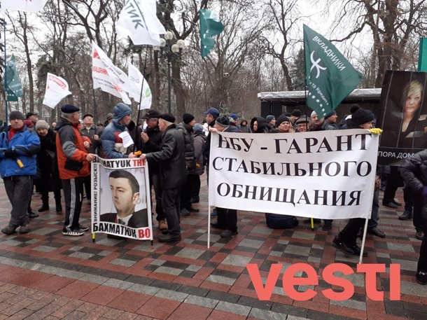Митингующие держали плакаты с призывом вернуть экс-главу НБУ Валерию Гонтареву в Украину, привлечь к ответственности экс-главу VAB Банка Олега Бахматюка и олигарха Константина Жеваго, которого во вторник, 3 декабря, разрешил арестовать суд.