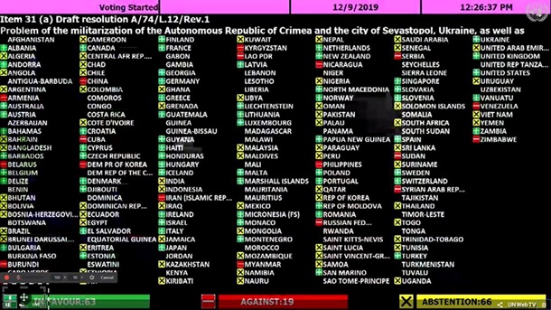 Напомним, предварительную резолюцию с таким же названием ГА ООН приняла 18 декабря 2018 года. В документе отмечается об угрозах безопасности, которые Россия создает для Украины, Черноморского региона и всей Европы переброской в Крым войск и оружия, в том числе самолетов и ракет, способных переносить ядерный заряд. Впервые звучит прямой призыв к России немедленно вывести из Крыма свои войска и безотлагательно прекратить его временную оккупацию.