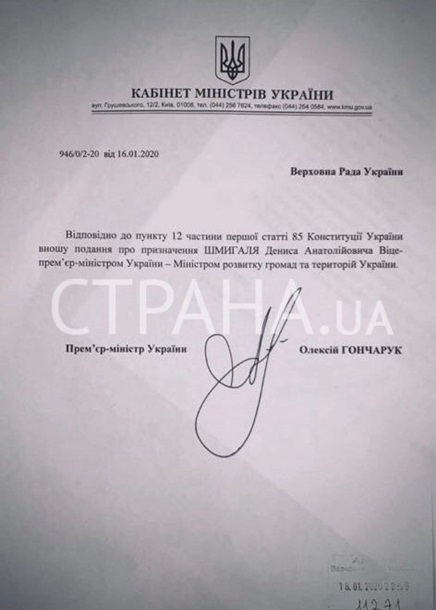Премьер-министр Алексей Гончарук подал в Верховную Раду представление о назначении вице-премьер-министром - министром развития общин и территорий Дениса Шмыгаля, сообщает Страна в четверг, 16 января.