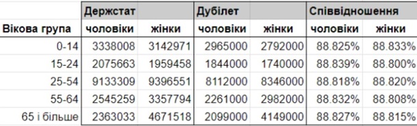 После этого обобщенные по возрастным группам данные сопоставили с показателями презентации Дубилет. Исследователей "поразило практическое одинаковое соотношение между группами по полу и возрасту - что составляет около 88,8%" (данные Дубилет от данных Госкомстата).