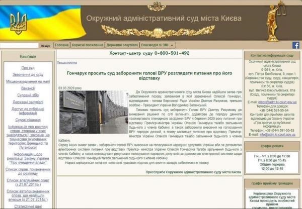 С сайта Окружного админсуда Киева исчезла публикация об иске премьер-министра Алексея Гончарука насчет запрета председателю Верховной Рады отправить его в отставку. Сообщение удалено во вторник, 3 марта.