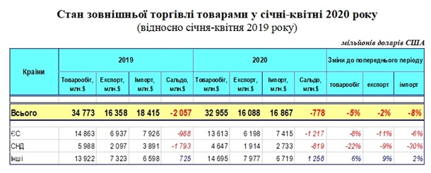 Экспорт товаров из Украины за первые четыре месяца 2020 года составил $16,088 млрд, что на 2% меньше, чем в прошлом году, импорт сократился на 8% до $16,867 млрд. Отрицательное сальдо зафиксировано на уровне $778 млн.