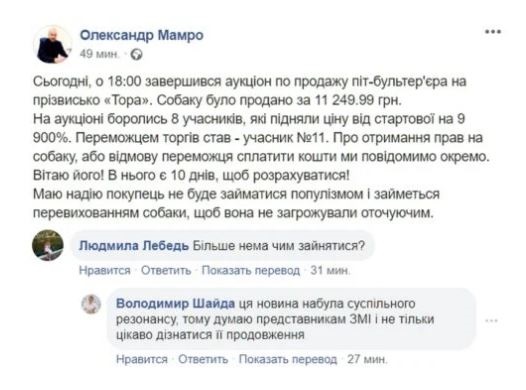 Выставленного на аукцион СЕТАМ питбультерьера по кличке Тора продали за 11 тыс. 250 грн. Торги закончились в пятницу, 22 мая, сообщил глава платформы Александр Мамро в Facebook.