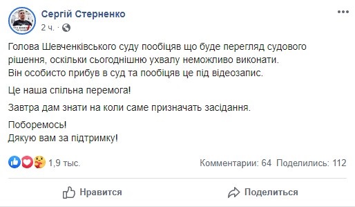 "Председатель Шевченковского суда пообещал, что будет пересмотр, поскольку сегодняшнее постановление невозможно выполнить. Он лично прибыл в суд и пообещал это под видеозапись", - отметил активист.