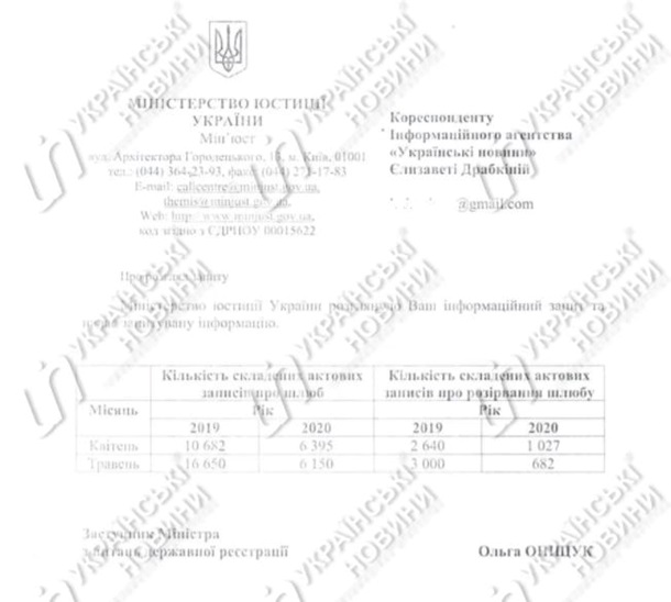 За период карантина в апреле-мае 2020 года число новых браков сократилось на 54,1%, или на 14 787 до 12 545, а новых разводов - на 69,7%, или на 3 931 до 1 709 в сравнении с 2019 годом. Об этом сказано в ответе Минюста на запрос Українських Новин во вторник, 30 июня.