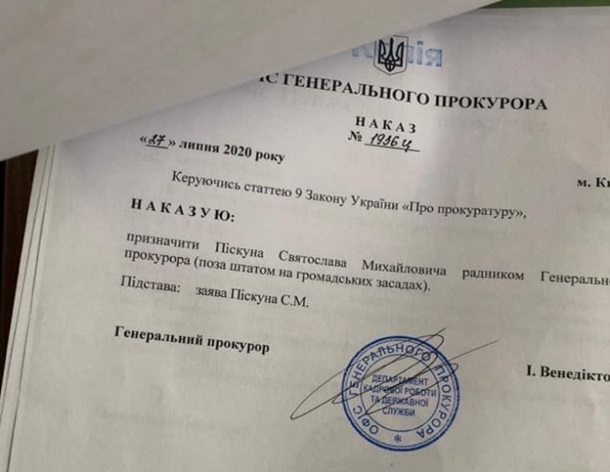 Луценко опубликовал фотографию указа Венедиктовой о назначении Пискуна советником. Указ гласит, что Пискун будет работать "вне штата, на общественных началах".