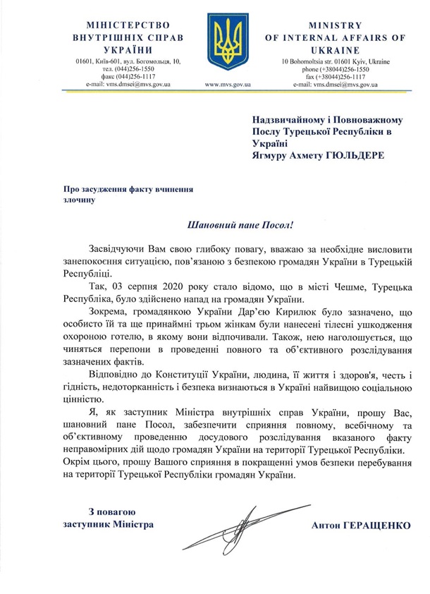 "По поручению Министра внутренних дел Арсен Аваков провел встречу с заместителем посла Турции в Украине - госпожой Букет Кабакджи и передал ей обращение по поводу жестокого избиения гражданки Украины Дарьи Кирилюк... в турецком городе Чешме вместе с еще тремя женщинами", - сообщил Геращенко.