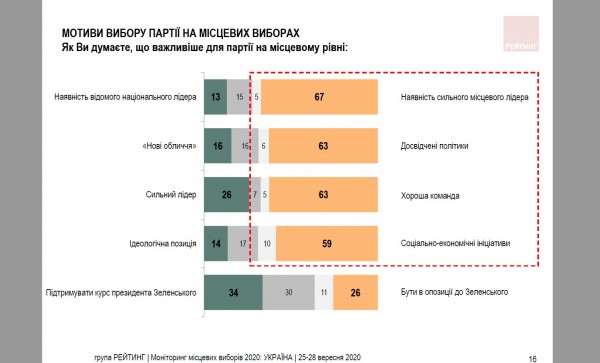 Так, за опыт выступает 63% респондентов, тогда как за “новые лица“ – только 16%. Также украинцы предпочитают хорошую команду (63%) вместо сильного лидера (26%). Кроме того, опрошенные считают, что на местных выборах для партий важнее иметь известного местного лидера (67%), вместо известного лидера общеукраинского уровня (13%).