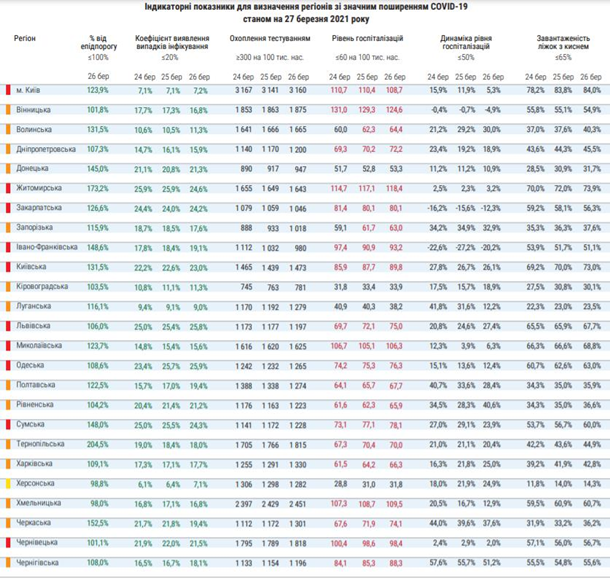 Согласно новому разделению, по состоянию на 27 марта в "красной зоне" находятся Киев и 9 областей: Житомирская, Закарпатская, Ивано-Франковская, Киевская, Львовская, Николаевская, Одесская, Сумская, Черниговская.