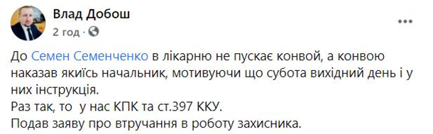 "К Семену Семенченко в больницу не пускает конвой, а конвою приказал какой-то начальник, мотивируя что суббота - выходной день, и у них инструкция. Раз так, то у нас КПК и ст. 397 УК. Подал заявление о вмешательстве в работу защитника", - написал адвокат.