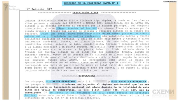 Журналисты выяснили, что Герасимов и его жена Наталья Бухалова владеют имением в 120 кв м в городке Хавеа провинции Аликанте на побережье Средиземного моря.