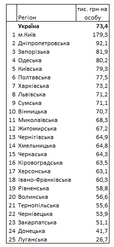 Самый низкий доход зафиксирован в Донецкой (41,7 тыс. грн) и Луганской (26,7 тыс. грн) областях.