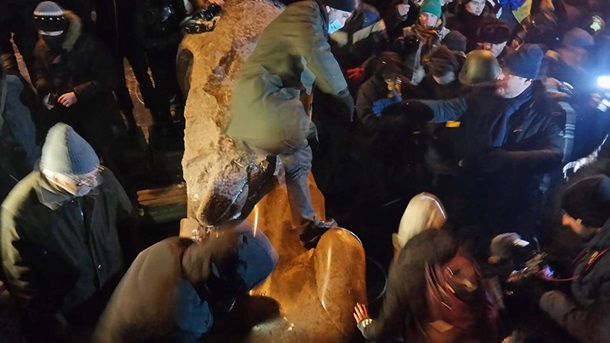 Один из очевидцев рассказал, что группа молодых людей подошла к памятнику, накинула на него железные тросы, руками потянули за них и памятник упал, передает корреспондент Громадське ТВ. Сейчас он лежит на земле, у памятника отколота голова. При падении он пробил асфальт.