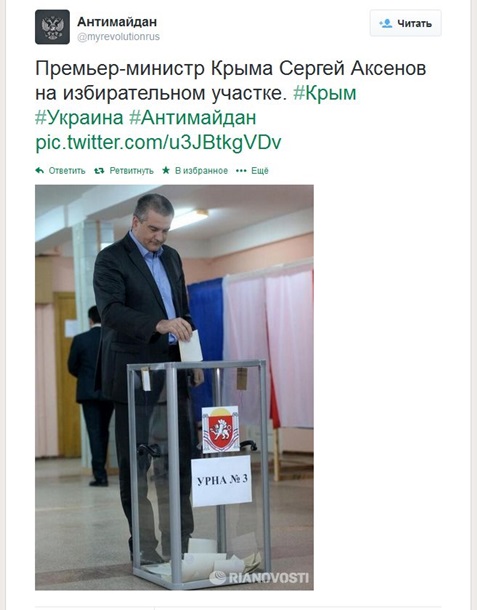 9:37 "Пункты Временного положения о референдуме, связанные с запретом агитации в «День тишины» и день референдума, не соблюдаются: на улицах много людей с российскими флагами, проводятся «братские» концерты («Город-герой Новороссийск городу-герою Севастополю»), на площади крутят ролик «Приди голосовать против угрозы фашизма!». Много плакатов, с призывами прийти проголосовать за Россию, или просто с призывом проголосовать, но оформленные в стиле российского флага. Премьер-министр Крыма Аксёнов уже в день референдума пишет в твиттере: «Референдум пройдёт так, как хочет этого народ Крыма и он будет неумолимым и безапелляционным, Крым станет частью России!» (в нарушение пунктов 3,4 Раздела 6 Временного положения о референдуме). Плакатов с призывом остаться в составе Украины пока не видно ни одного", - рассказывают наблюдатели.