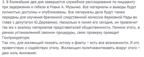 "В ближайшие два дня завершится служебное расследование по инциденту при задержании и гибели в Ровно А. Музычко. Все материалы и выводы будут полностью доступны и опубликованы", – написал он.