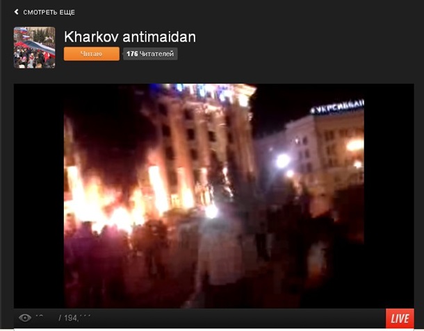 0:19 Пожар в здании Харьковской облгосадминистрации потушен. Сгорела как минимум одна комната. Активисты заняли верхние этажи здания и вывесили российский флаг. Правоохранители, перекрывающие вход к зданию, отступили.