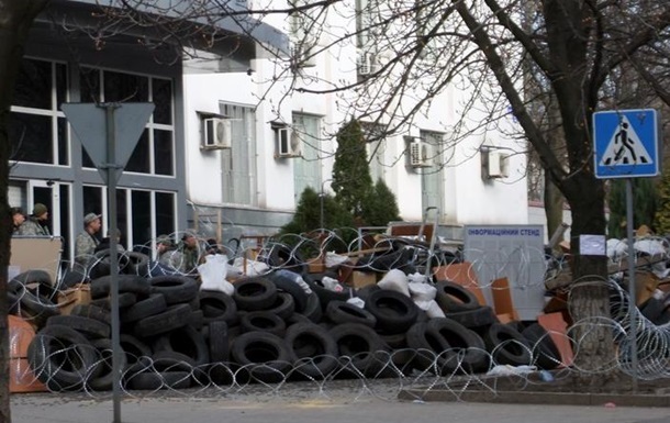 10:30 Активисты за ночь укрепили баррикады из автомобильных покрышек и колючей проволоки на ступенях захваченной накануне Донецкой ОГА.