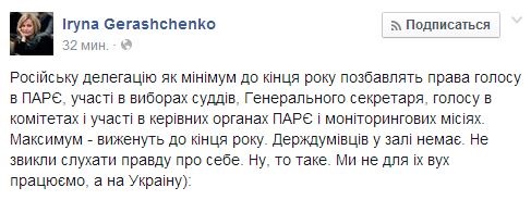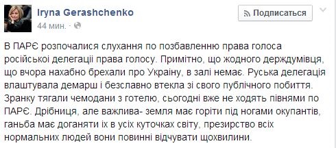 «В ПАСЕ начались слушания по лишению российской делегации права голоса. Примечательно, что ни одного госдумовца, которые вчера нагло врали об Украине, в зале нет. Русская делегация устроила демарш и бесславно сбежала от своего публичного избиения. Утром таскали чемоданы из отеля, сегодня уже не ходят петухами по ПАСЕ», - написала Геращенко.
