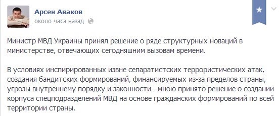 "Новая структура специальных подразделений МВД - ответ диверсантам, "зеленым человечкам" и прочим бандформированиям, имеющим задачу атаковать государственность и целостность Украины", - сообщает министр.