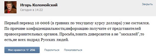 "Первый перевод 10 000$ (в гривнах по текущему курсу доллара) уже состоялся. По причине конфиденциальности, информацию получите от представителей правоохранительных органов. Просьба ловить диверсантов, а не "москалей", то есть, не всех подряд Русских людей, - днем 17 марта было написано на официальной странице Коломойского ВКонтакте.