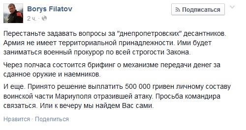 «Принято решение выплатить 500 000 гривен личному составу воинской части Мариуполя, отразившей атаку. Просьба командира связаться. Или к вечеру мы найдем Вас сами», - сообщил Филатов.