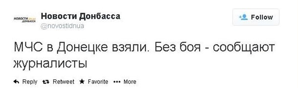 "МЧС в Донецке взяли. Без боя - сообщают журналисты", - сообщает издание Новости Донбасса в Twitter.