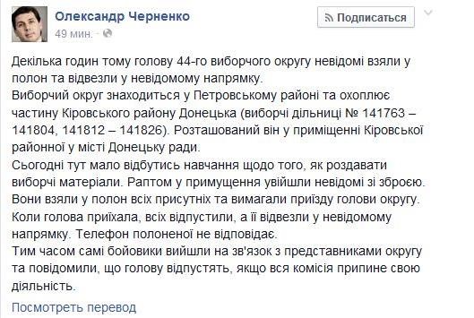 "Несколько часов назад председателя 44-го избирательного округа неизвестные взяли в плен и увезли в неизвестном направлении", - отметил Черненко на своей страничке в Фейсбуке.