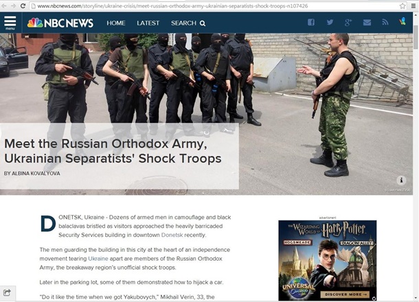 Ковалева называет Русскую православную армию неофициальными ударными войсками сепаратистского Донбасса. Она встретилась с ее бойцами в Донецке в то время, когда они охраняли местное здание СБУ.