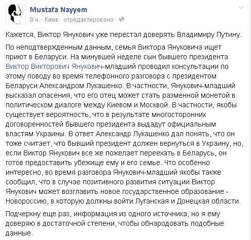 По его информации, Виктор Янукович перестал доверять президенту РФ и ищет укрытия в Беларуси. По неподтвержденным данным, Виктор Янукович-младший проводил консультации по этому поводу во время телефонного разговора с президентом Беларуси Александром Лукашенко.