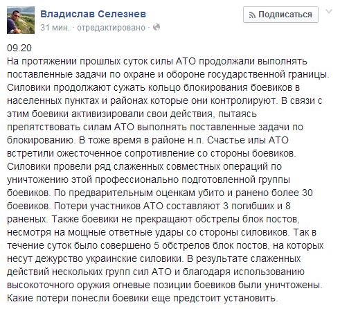 В результате боя в районе Счастье Луганской области, по предварительным оценкам, убито и ранено более 30 сепаратистов. Об этом сообщил пресс-секретарь сил АТО Владислав Селезнев на своей странице в Facebook.