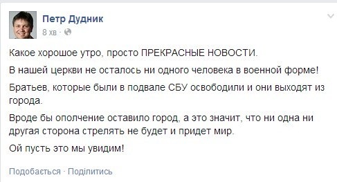 "В нашей церкви не осталось ни одного человека в военной форме! Братьев, которые были в подвале СБУ, освободили и они выходят из города", - пишет местный житель Петр Дудник на своей странице в Facebook.