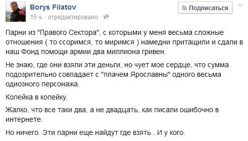 Месяц назад "Правый сектор" в Днепропетровске на нужды армии сдал 2 миллиона гривен. Об этом сообщил и. о. заместителя председателя Днепропетровской областной государственной администрации Борис Филатов на своей странице в Facebook.