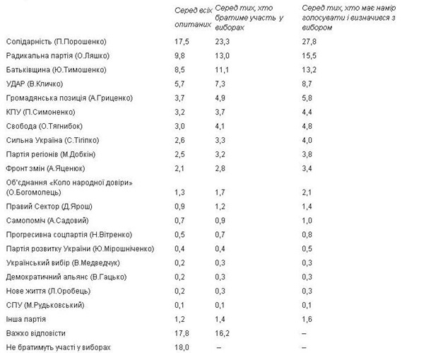 Вместе с тем, около 4% избирателей готовы голосовать за Свободу и КПУ. Около 3% набрали бы Сильная Украина, Партия регионов и Фронт Змин. А партия экс-кандидата в президенты Ольги Богомолец набрала бы чуть меньше 2%, Правый сектор и Самопомощь Садового - около 1%.
