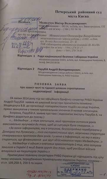 Виктор Медведчук подал в суд на секретаря СНБО Андрея Парубия. Об этом на своей странице в Facebook сообщил сам Парубий, опубликовав также скан искового заявления.