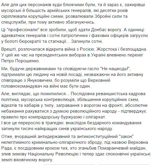 Ярош также заявил, что нынешние власти делают все, чтобы "отдать Донбасс врагу, а единицы адекватных генералов и сотни патриотических и профессиональных офицеров увязли в болоте бюрократии и стагнации, погибли сотни".