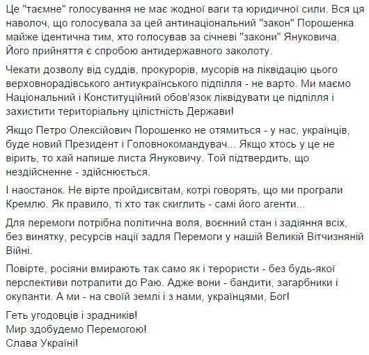 Ярош назвал представителей нынешних властей "сознательными предателями", а закон об особом статусе Донбасса - "антинациональным", и заявил, что тайное голосование, на котором он был принят, "не имеет никакого значения и юридической силы".