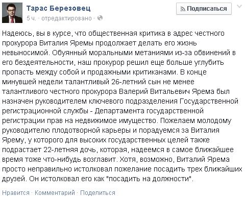 Эту информацию также подтверждает политтехнолог Тарас Березовец. По его словам, сын генерального прокурора Виталия Яремы стал директором Департамента лишь в конце прошлой недели.