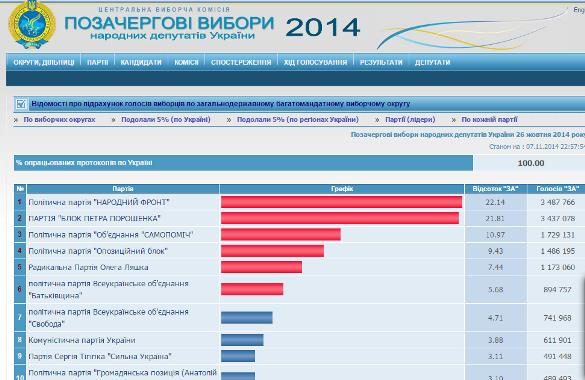 Центральная избирательная комиссия Украины обработала все протоколы избирательных комиссий в электронном виде. По результатам голосования на внеочередных парламентских выборах в многомандатном общегосударственном округе в Верховную Раду проходят шесть партий.