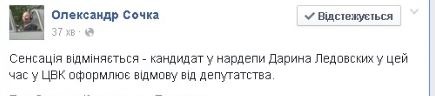 "Сенсация отменяется - кандидат в нардепы Дарья Ледовских в настоящее время в ЦИК оформляет отказ от депутатства", - написал он в соцсети.