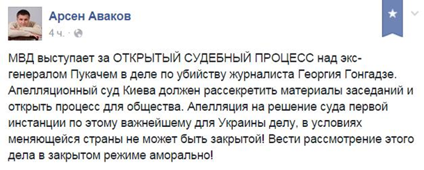 "МВД выступает за открытый судебный процесс над экс-генералом Пукачем в деле по убийству журналиста Георгия Гонгадзе. Апелляционный суд Киева должен рассекретить материалы заседаний и открыть процесс для общества. Апелляция на решение суда первой инстанции по этому важнейшему для Украины делу в условиях меняющейся страны не может быть закрытой", - написал глава МВД.