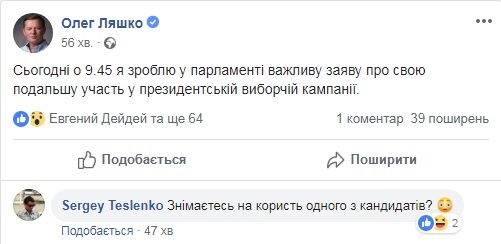 Ляшко анонсировал "важное заявление" о своем участии в выборах