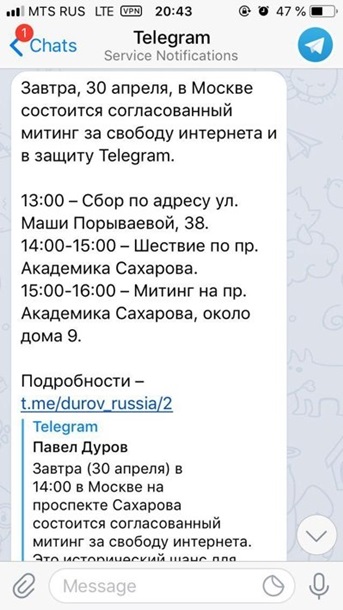 Уведомление содержит ссылку на запись основателя Telegram Павла Дурова - первую в его русскоязычном телеграм-канале, который был создан 29 апреля. Дуров называет митинг 30 апреля "историческим шансом для москвичей выразить общую позицию".